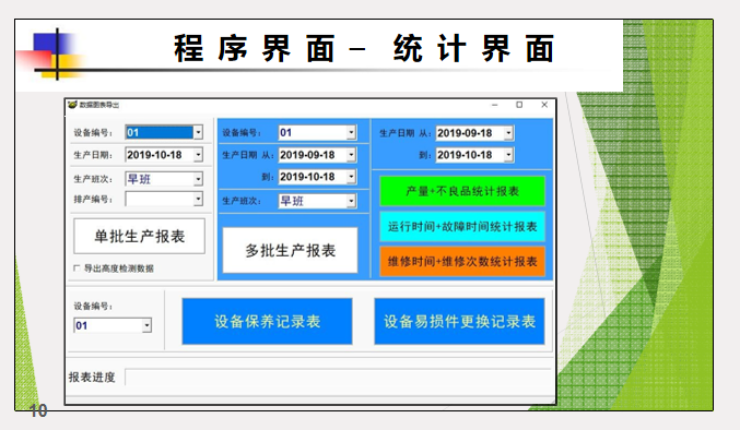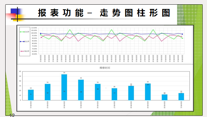 有豐富的統(tǒng)計功能,對于產(chǎn)量、不良品按時間進(jìn)行統(tǒng)計,統(tǒng)計維修時間、維修次數(shù)、停 機(jī)時間、停機(jī)次數(shù)、運行時間,這些龐大的基礎(chǔ)數(shù)據(jù)進(jìn)行歸類,可以為決策者制定生產(chǎn) 和設(shè)備改善計劃提供強(qiáng)大的數(shù)據(jù)支持。