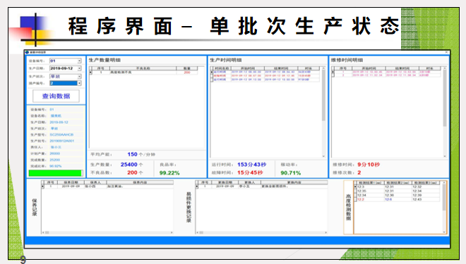 可以記錄每個生產(chǎn)批次的生產(chǎn)數(shù)量、不良數(shù)量、停機(jī)時間、運行時間、維修時間、維修 次數(shù),可以記錄設(shè)備的保養(yǎng)和易損件更換。